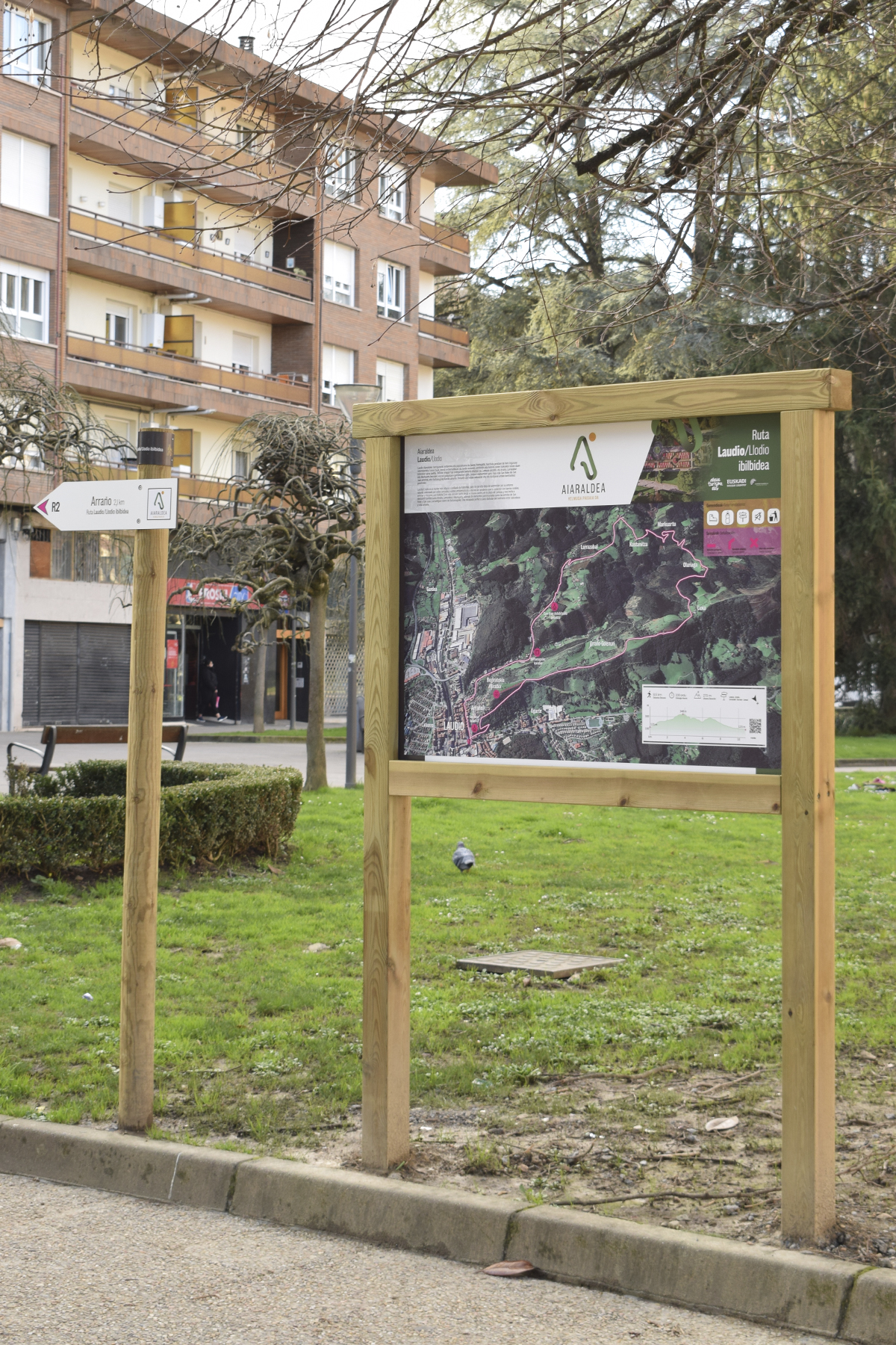Flechas HPL con núcleo negro y grabado CNC en bajorrelieve (texto y pictogramas). Poste de madera rolliza torneada y vitola superior con gráfica laminada UV y protección anti-grafiti
